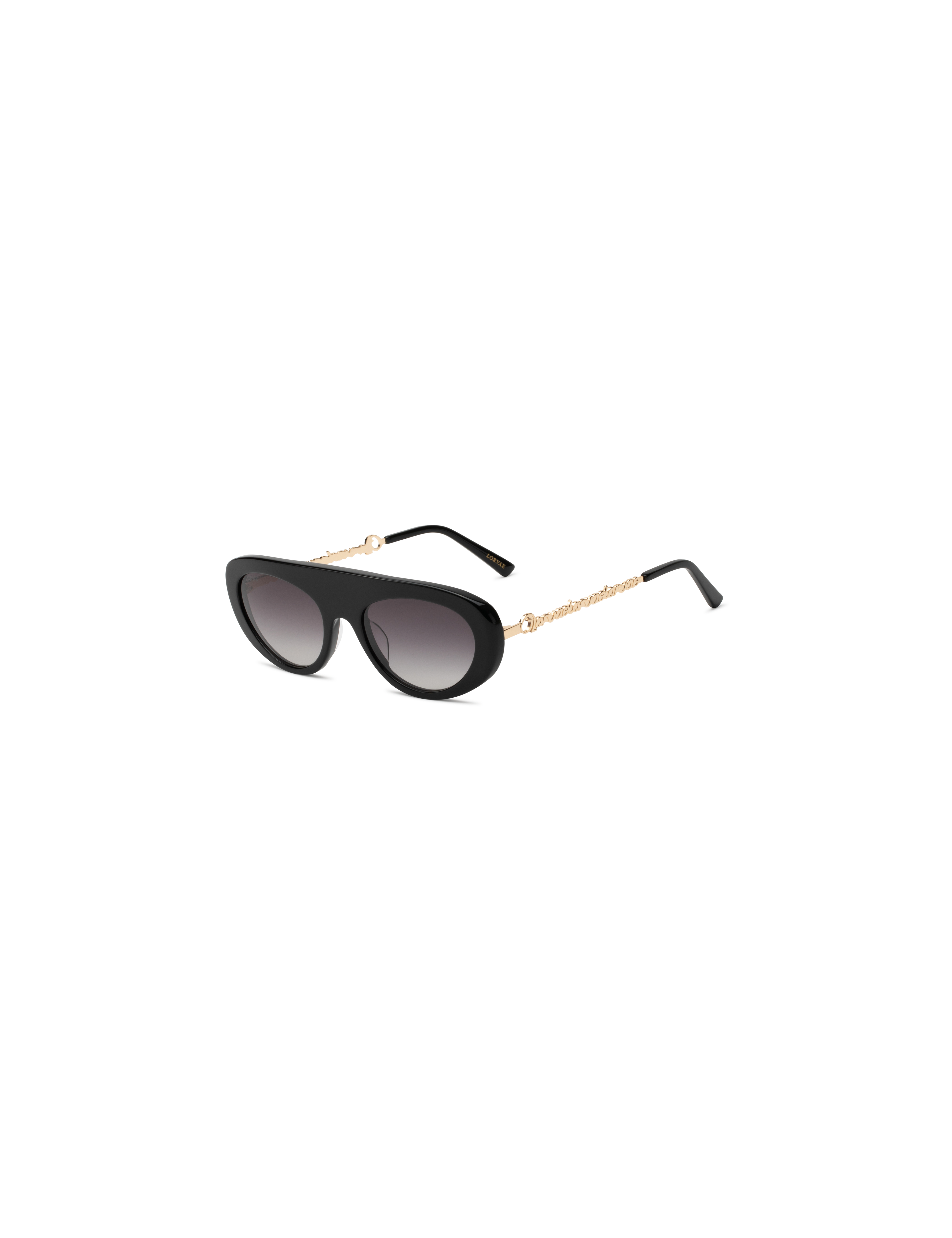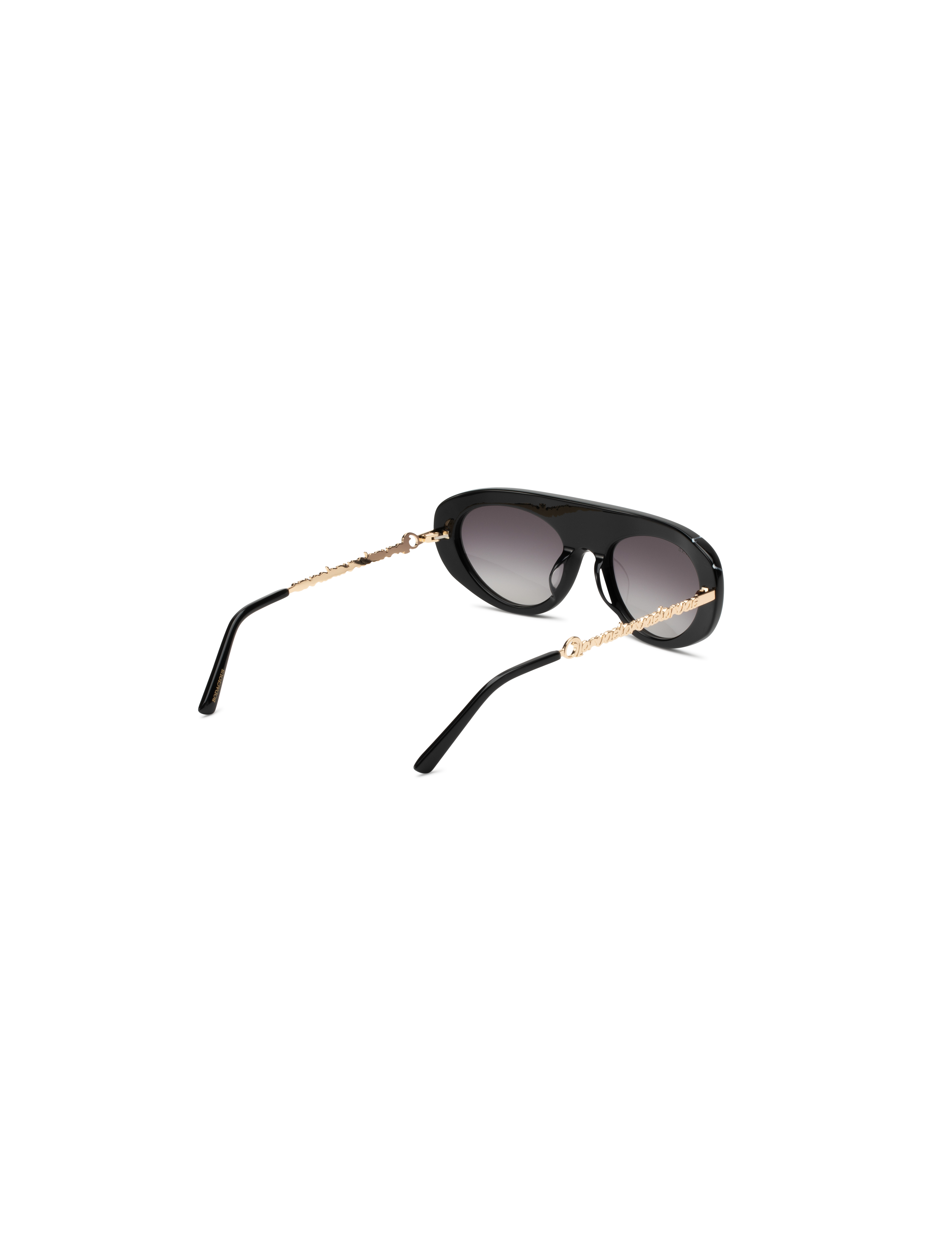 Bodacious features a large frame with a cutout metal logo design on the temples.