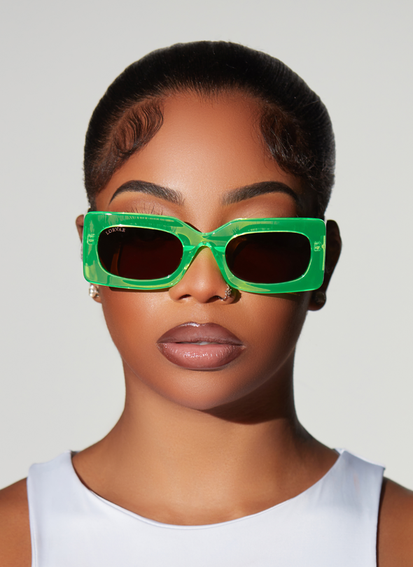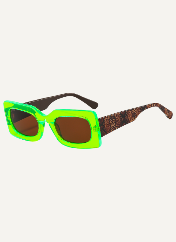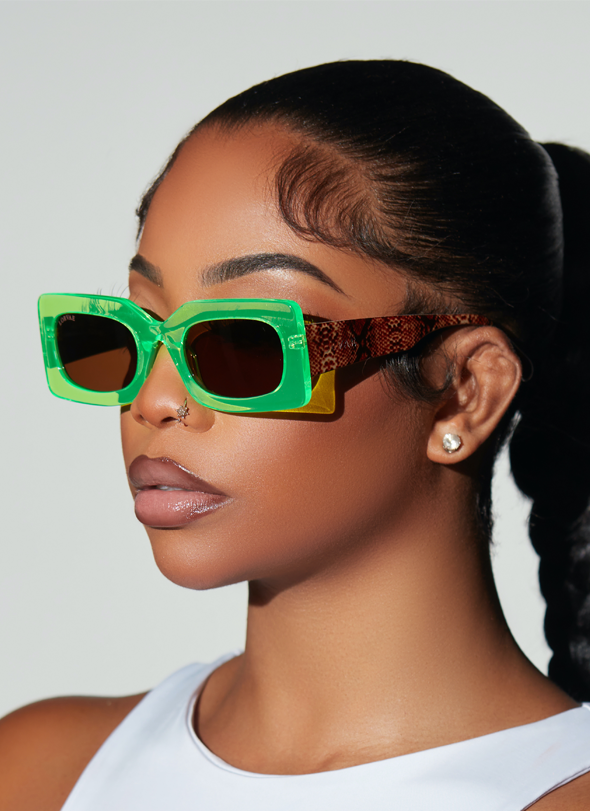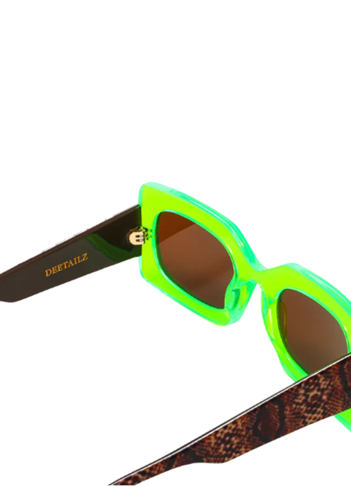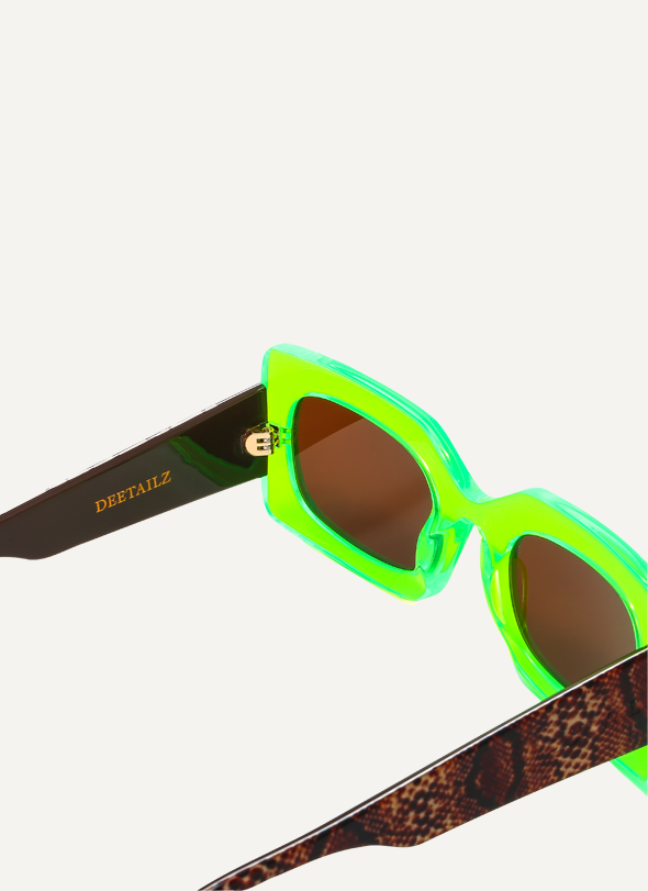 Our founder De’arra has a thing for all things details. Hence why DEETAILZ is so fitting for this very elaborate pair. The neon frames with the snake skin pattern can elevate a toned down look and complete a fire fit.