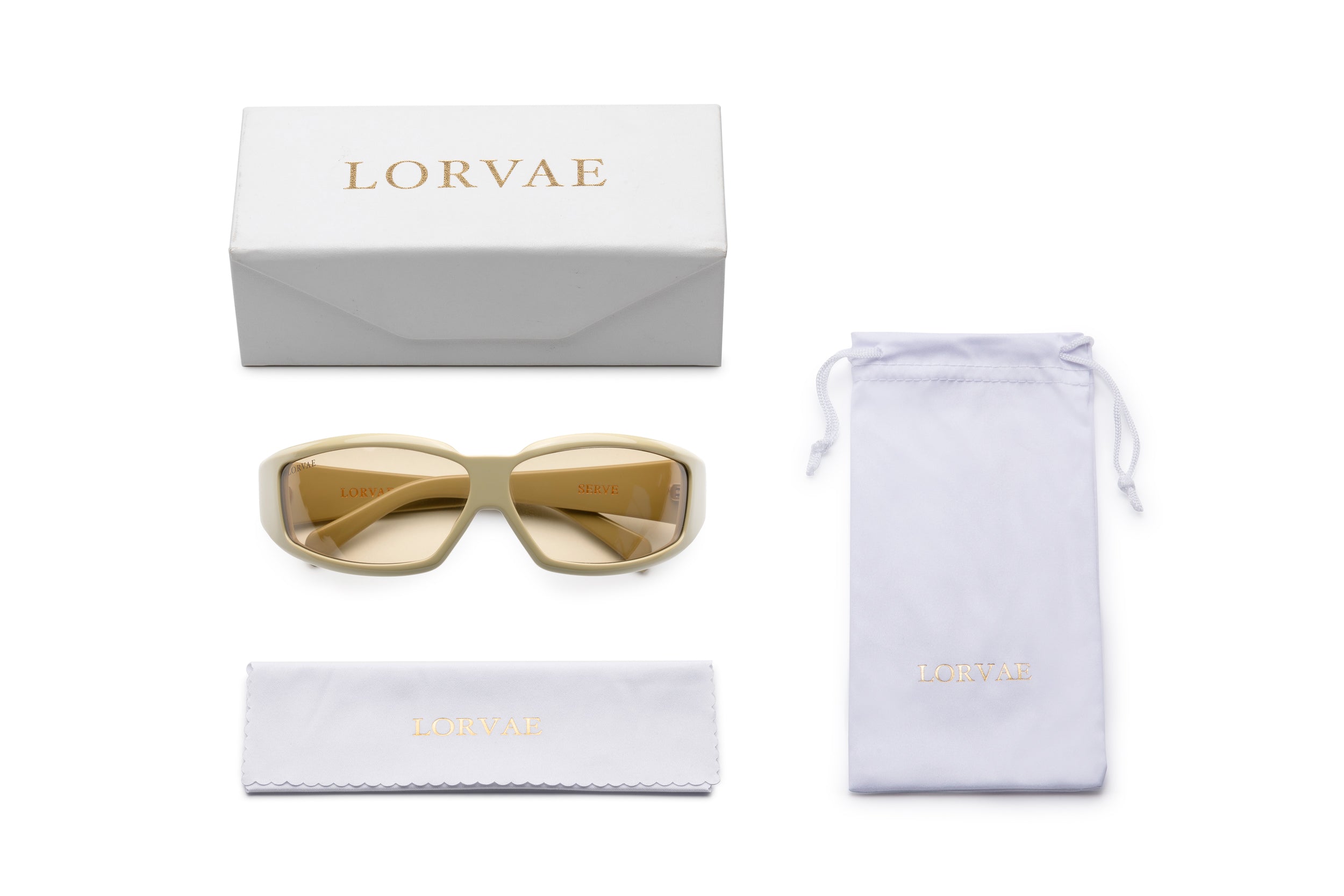 SERVE is a statement frame designed for presence. With its wrapped silhouette and warm, gradient lenses, SERVE brings a modern, confident energy to any look. The creamy finish adds a soft touch to the bold shape, while the subtle “L” detail along the arm delivers the signature Lorvae imprint.