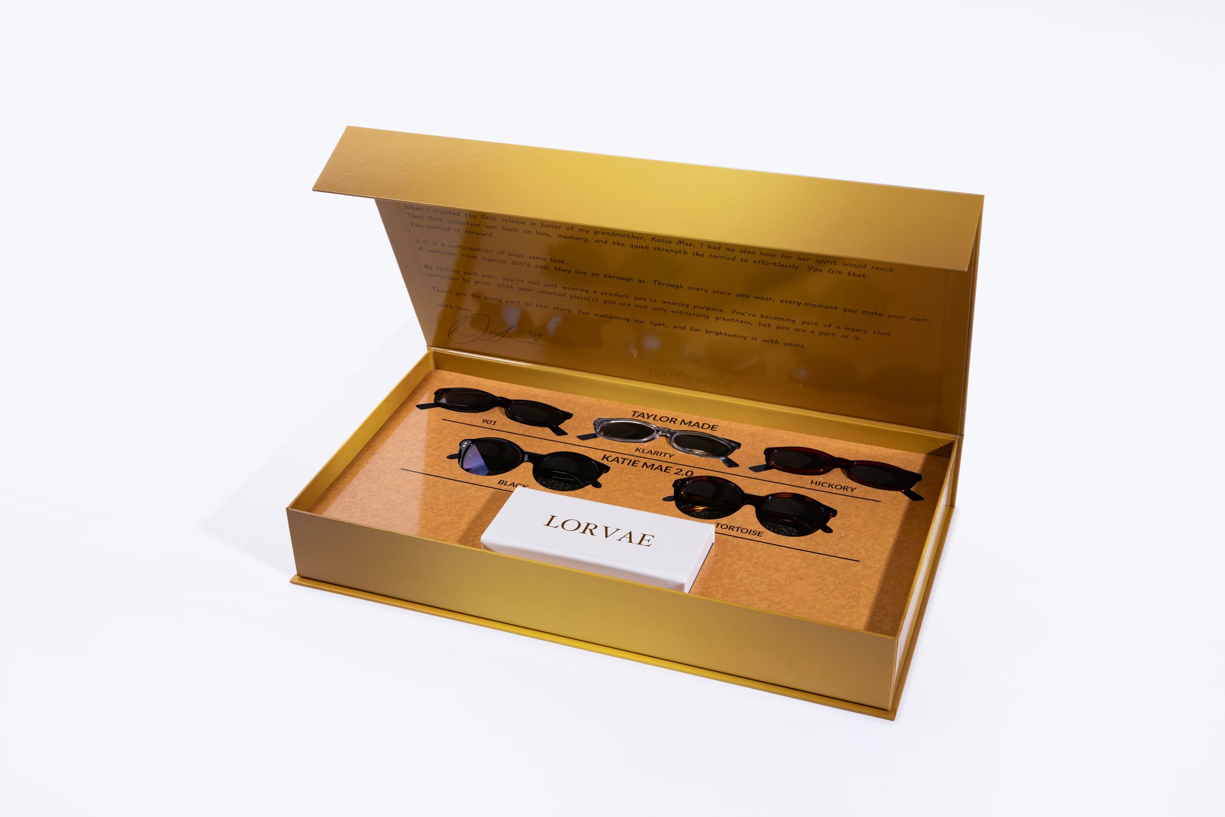 All five frames from the Katie 2.0 Collection are included in this box and are designed to feel like an heirloom, rich, radiant, and rooted in meaning. From the reflective shine of gold to the intentional beauty in every frame, this PR experience captures the lore of “Katie Mae”: bold, personal, and polished. Wrapped in vintage-inspired opulence, this box isn't just a box it’s a vault of legacy.